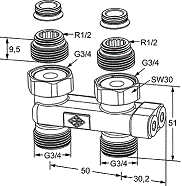 lub G3/4, złącza samouszczelniające z odcięciem, do systemów dwururowych, mosiądz niklowany.