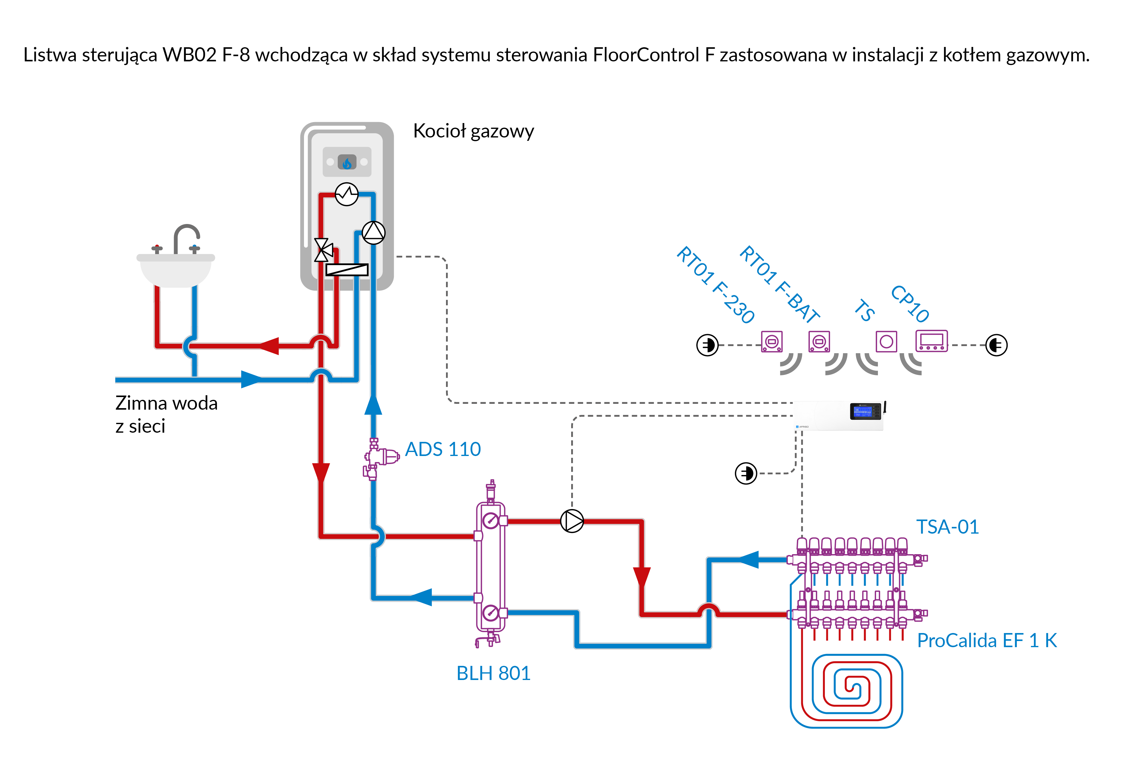 Steruje instalacją poprzez otwieranie i zamykanie przpeływu czynnika w poszczególnych pętlach instalacji płaszczyznowej za pomocą siłowników termoelektrycznych.