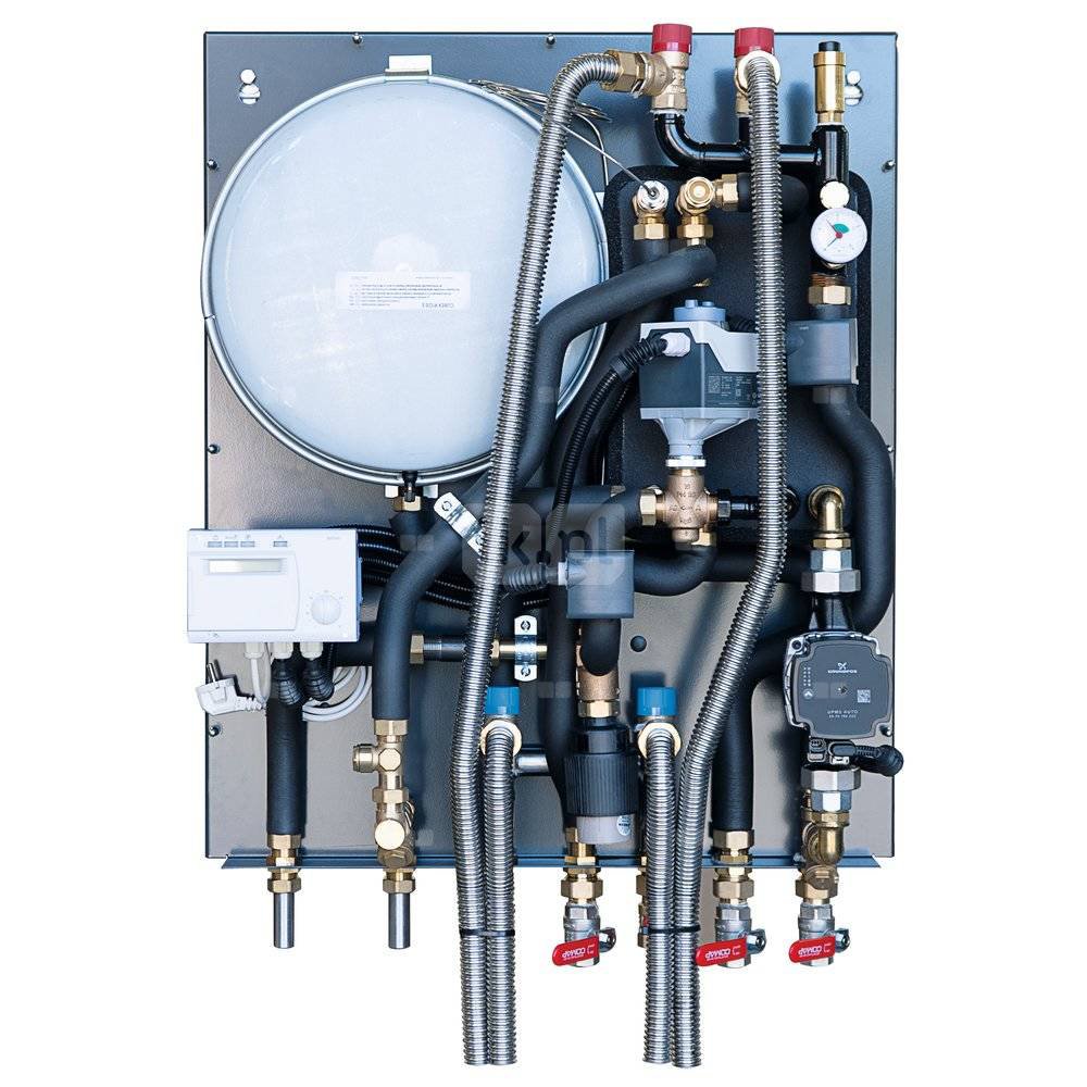 Składa się z: zaworów kulowych odcinających, zaworu różnicy ciśnień, wymiennika 30-płytowego, zaworu regulacyjnego, siłownika, 2 zaworów bezpieczeństwa c.o. 3 bary, manometrów, termometrów, pompy UPML AUTO 25-95, obudowy, regulatora pokojowego, naczynia przeponowego 24 I, izolacji. Max. moc dla c.o. 50 kW.