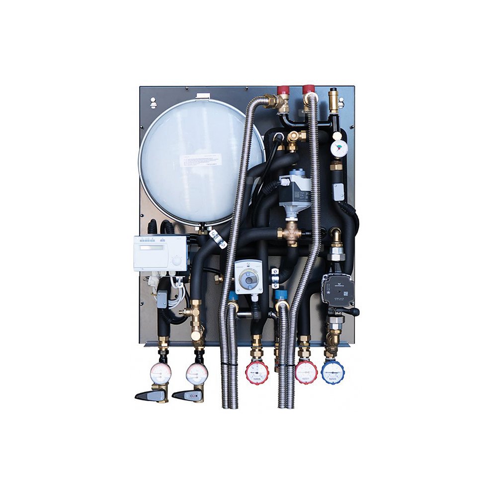 Składa się z: końcówek do wspawania po stronie pierwotnej i z zaworów kulowych odcinających po stronie wtórnej, wstawki na zawór różnicy ciśnień, dwóch wymienników płytowych lutowanych, zaworu regulacyjnego, siłownika, 2 zaworów bezpieczeństwa c.o. 3 bary, manometru, pompy UPML AUTO 25-90, naczynia przeponowego 18 I, 2 zaworów bezpieczeństwa c.w.u. 6 bar, izolacji. Max. moc dla c.o. 50kW.