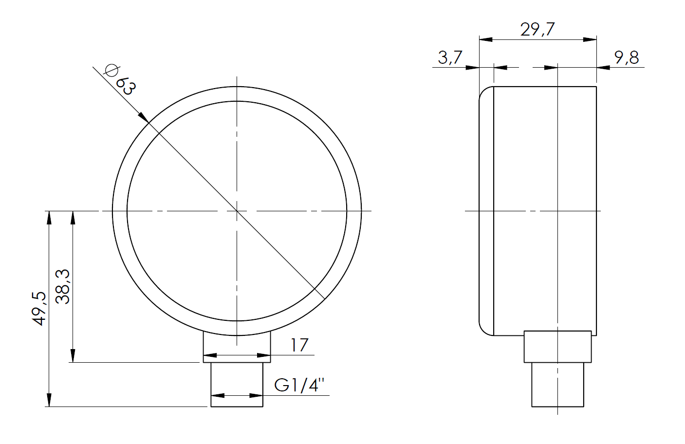 Manometr z rurką Bourdona AFRISO RF grzewczy 0/4 bar G1/4B radialne fi 63 mm, kl. 2.5%