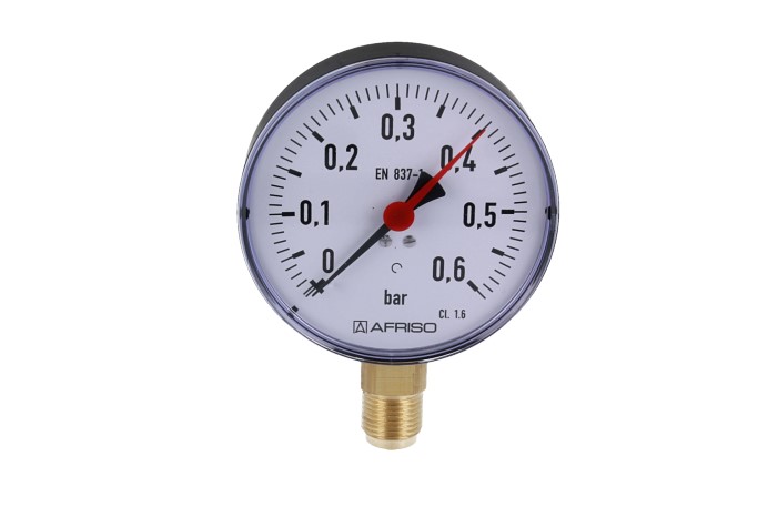 Manometr z rurką Bourdona AFRISO RF standardowy 0/0,6 bar G1/2B radialne fi 100 mm, kl. 1.6%