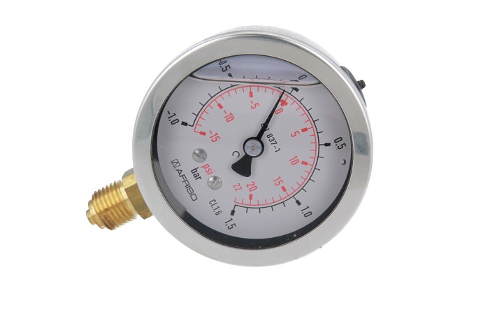 Manometr z rurką Bourdona AFRISO RF wstrząsoodporny -1/1,5 bar G1/4B radialne fi 63 mm, kl. 1.6%