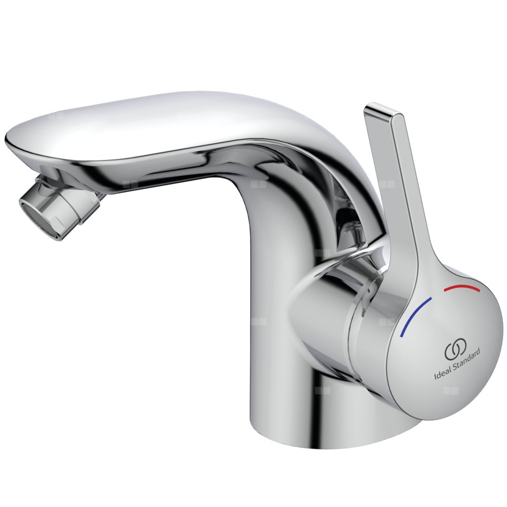Bateria bidetowa jednootworowa Melange. Głowica 35 mm z ogranicznikiem przepływu gorącej wody. Odlewany korpus z otworem na wysuwane cięgno. Czerwone i niebieskie oznaczenie na uchwycie. Metalowy automatyczny korek. Perlator kaskadowy M18X1 z przegubem kulowym. Elastyczne węże D10.