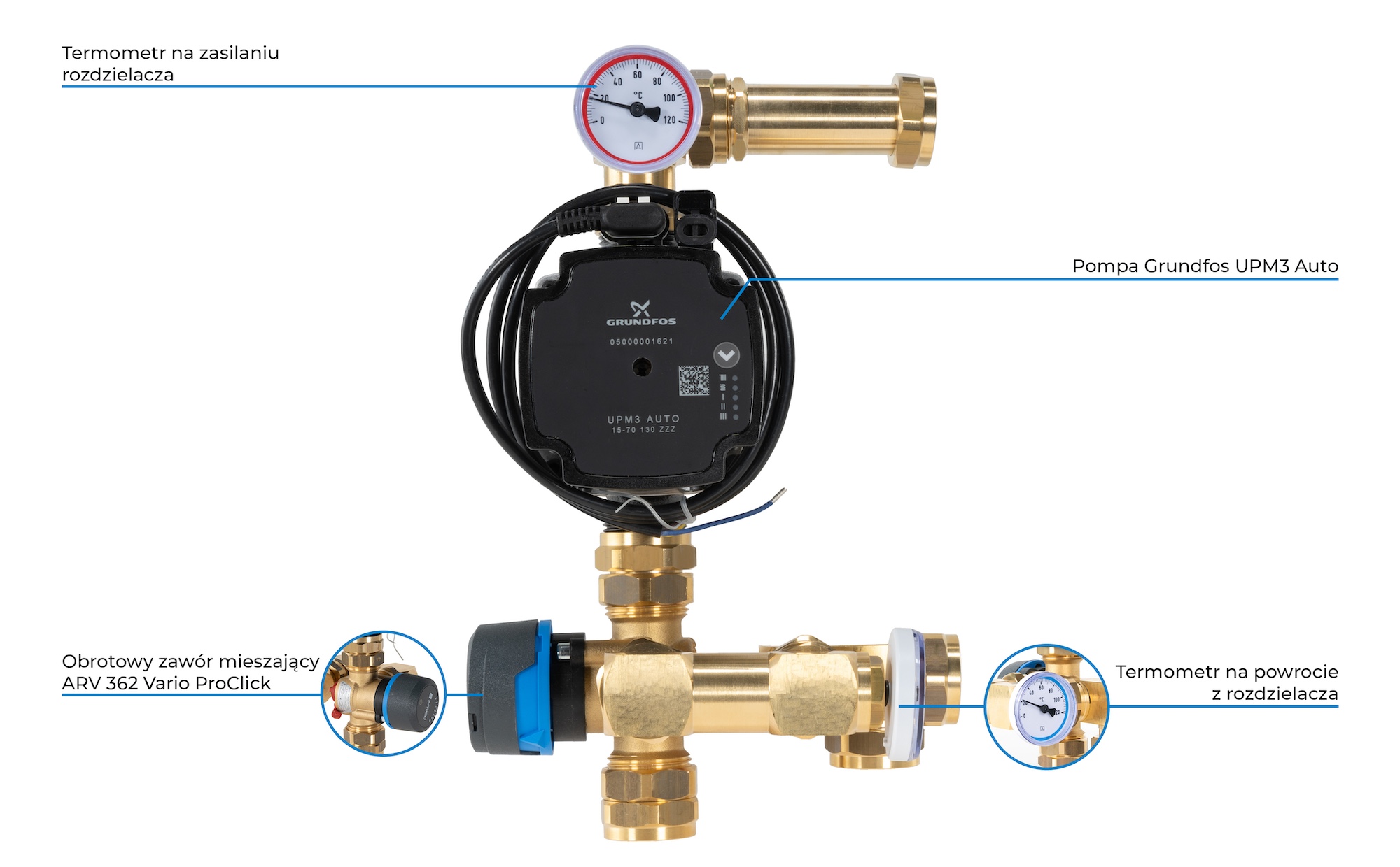 Termometry na zasilaniu i powrocie z rozdzielacza kontrolują temperaturę medium.