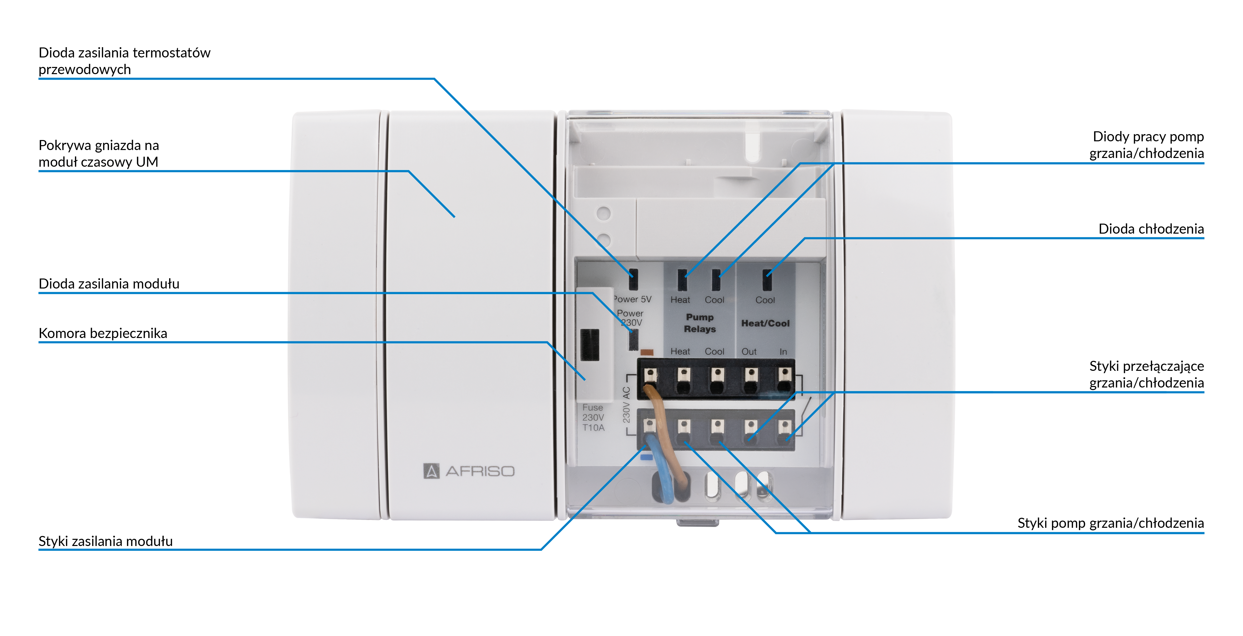Umożliwia sterowanie pracą pomp grzania i chłodzenia przez dedykowane styki przełączające.