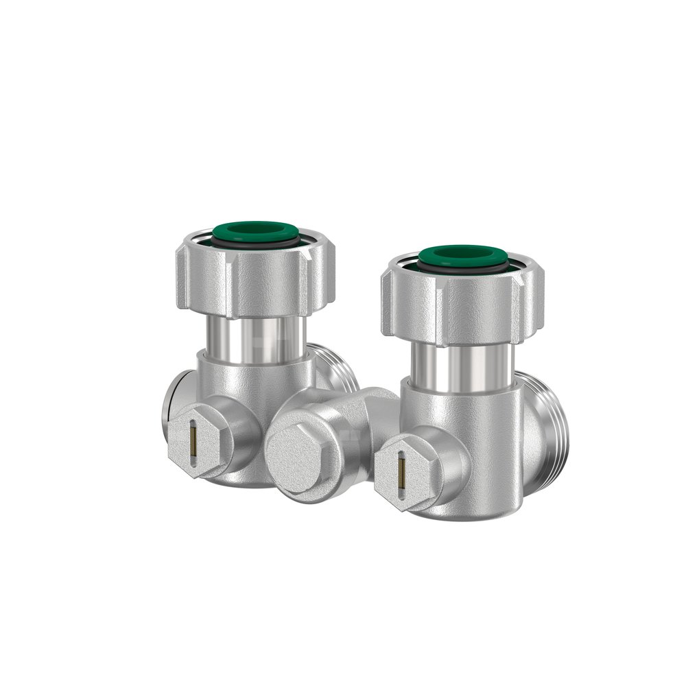 Blok kurków z zabezpieczeniem przed przepływem zwrotnym do grzejników ze zintegrowanym zaworem, stopień zasilania grzejników 30 - 100% (ustawienie fabryczne na 35%), z odcięciem kulowym, głowica sterująca z ukrytym ogranicznikiem, ze stożkiem Euro po stronie rury do podłączenia ze złączkami zaciskowymi, rozstaw osiowy 50 mm. Możliwość zamiany przewodu zasilającego i powrotnego poprzez wymianę zabezpieczenia przed przepływem zwrotnym.