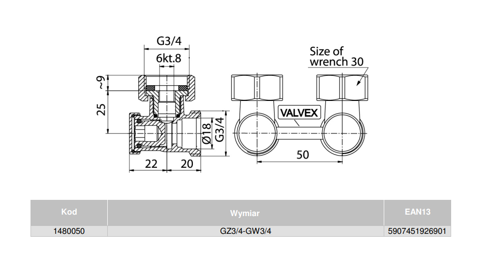 Moduł przyłączeniowy kątowy VALVEX FUSION tulejki mosiądz (niklowany) 3/4'' x 3/4'', rozstaw 50 mm do grzejników