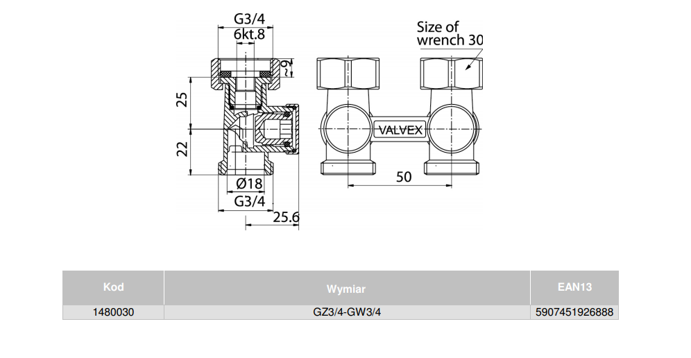 Moduł przyłączeniowy prosty VALVEX FUSION przyłącza mosiądz (niklowany) 3/4'' x 3/4'', rozstaw 50 mm do grzejników