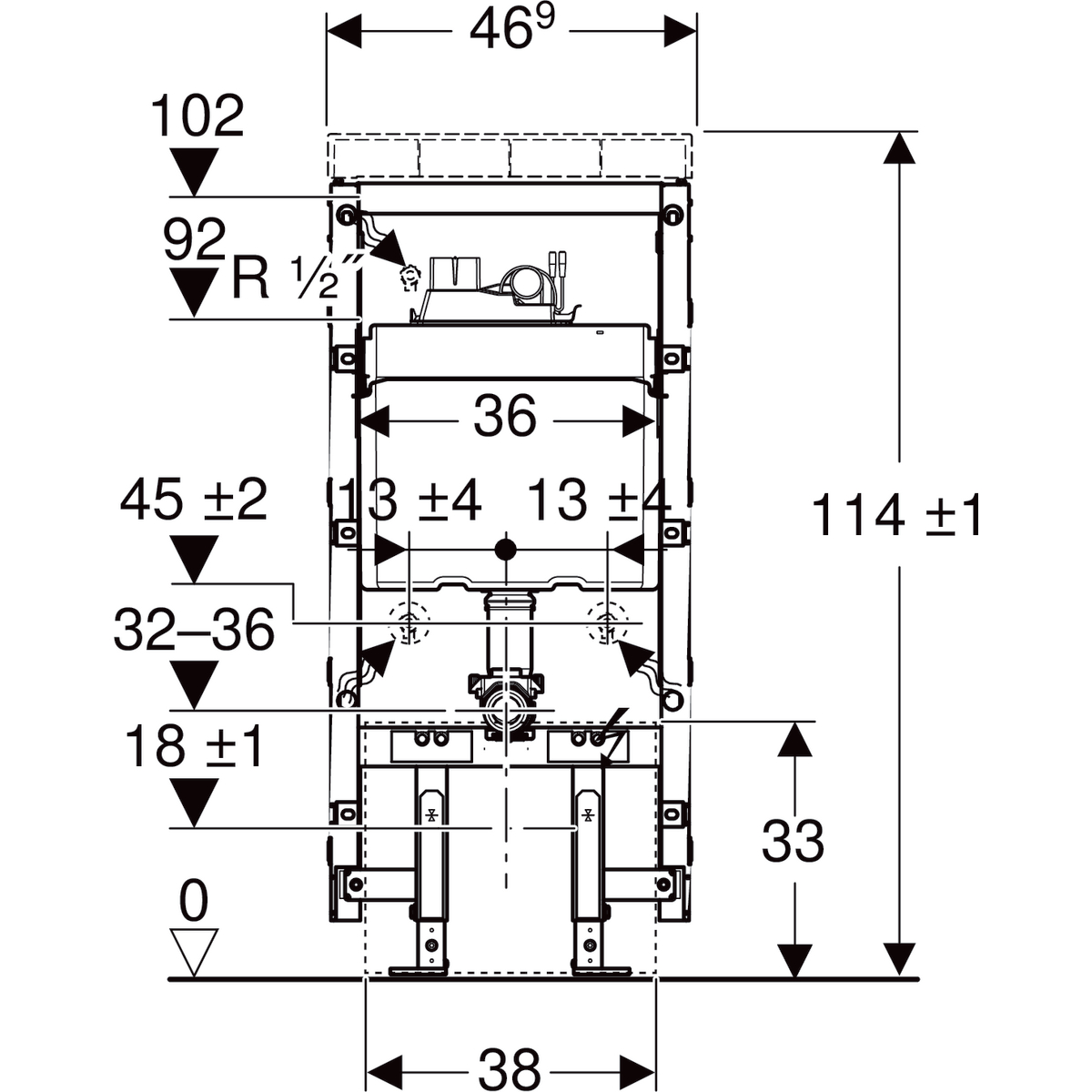 Seria 2025 Statyczna rama samonośna, zabezpieczona przed korozją powłoką malowaną proszkowo Rama do wiszących misek WC o wymiarach przyłączeniowych zgodnych z normą EN 33 i wysunięciu do 70 cm Z wysuwaną blachą do bocznego mocowania nad elementem na profilach metalowych lub drewnianych bądź na elementach konstrukcyjnych Geberit Duofix Alternatywna pozycja mocowania wspornika dystansowego Obrotowe stopy, odpowiednie do montażu w profilach U UW 50 i UW 75 Stopy można zamontować w szynie systemowej Geberit Duofix bez użycia narzędzi, bez dodatkowych komponentów Ocynkowane nogi montażowe, zabezpieczone przed korozją, antypoślizgowe Kolano przyłączeniowe z możliwością montażu na różnych głębokościach bez użycia narzędzi, zakres regulacji 45 mm Spłuczka podtynkowa Geberit Sigma 12 cm, z izolacją przeciwroszeniową Do uruchamiania z przodu, nadaje się do spłukiwania jednoilościowego, dwudzielnego i spłukiwania z funkcją "stop" W przypadku ustawień fabrycznych ponowne spłukiwanie możliwe natychmiast Prace montażowe i serwisowe przy spłuczce podtynkowej bez użycia narzędzi Przyłącze wody z tyłu lub na górze na środku Obudowa ochronna otworu rewizyjnego z możliwością skrócenia, chroni przed wilgocią i zabrudzeniami Z peszlem ochronnym do dopływu dla toalet myjących Geberit AquaClean i do przewodu przyłączeniowego Mocowanie przyłącza elektrycznego i Power & Connect Box Do metalowych i drewnianych ścianek konstrukcyjnych Do ścianek systemowych Geberit Duofix Do montażu w ściankach instalacyjnych o częściowej wysokości lub wysokości pomieszczenia Do montażu w ściankach działowych na wysokość pomieszczenia Do wysokości warstw podłogi 0–25 cm Do misek wiszących