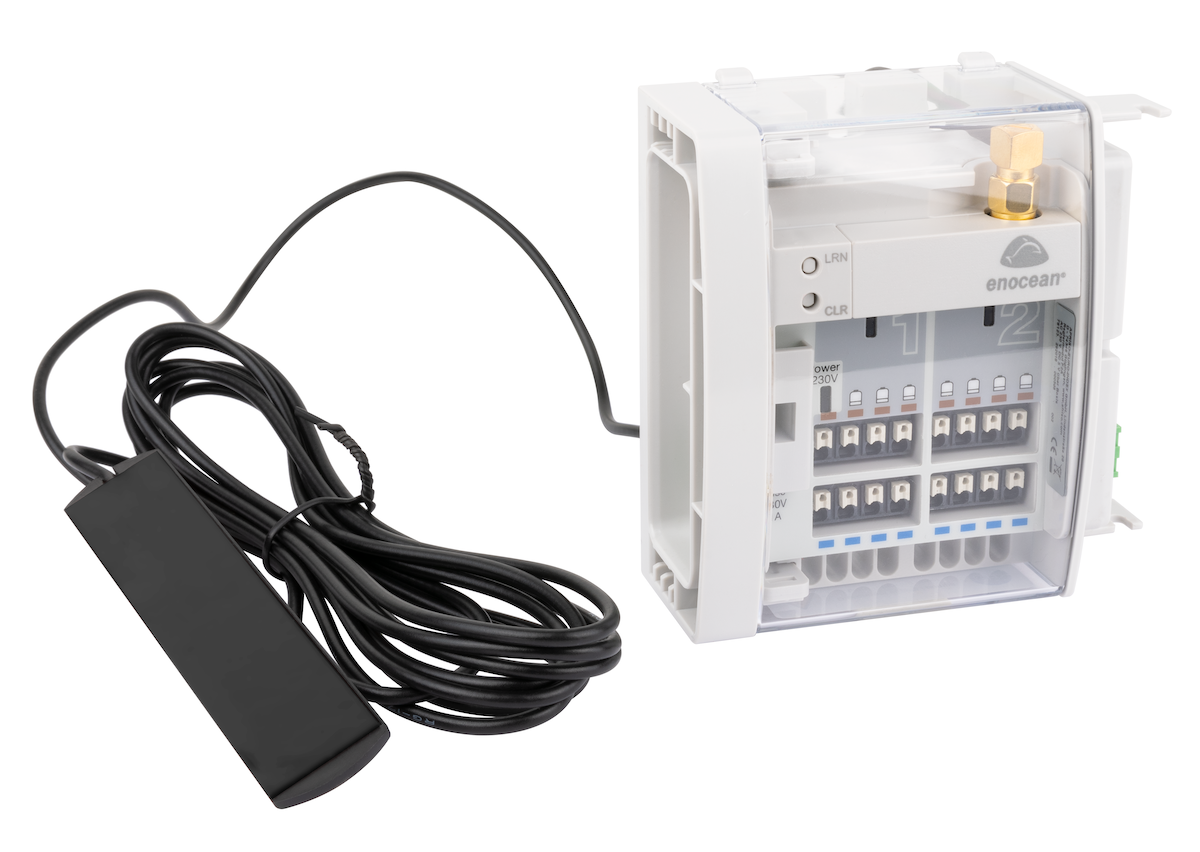 Antena zewnętrzna wyprowadza odbiornik sygnału EnOcean poza szafkę rozdzielacza, poprawiając zasięg.