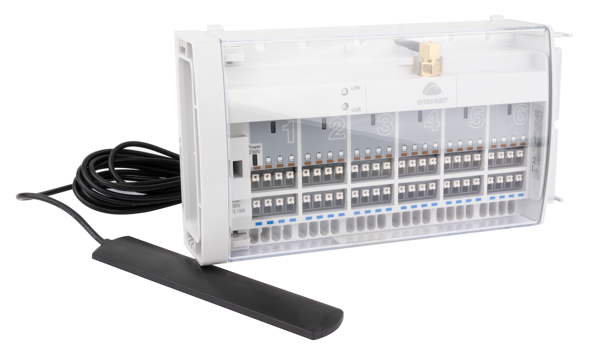 Antena zewnętrzna wyprowadza odbiornik sygnału EnOcean poza szafkę rozdzielacza, poprawiając zasięg.