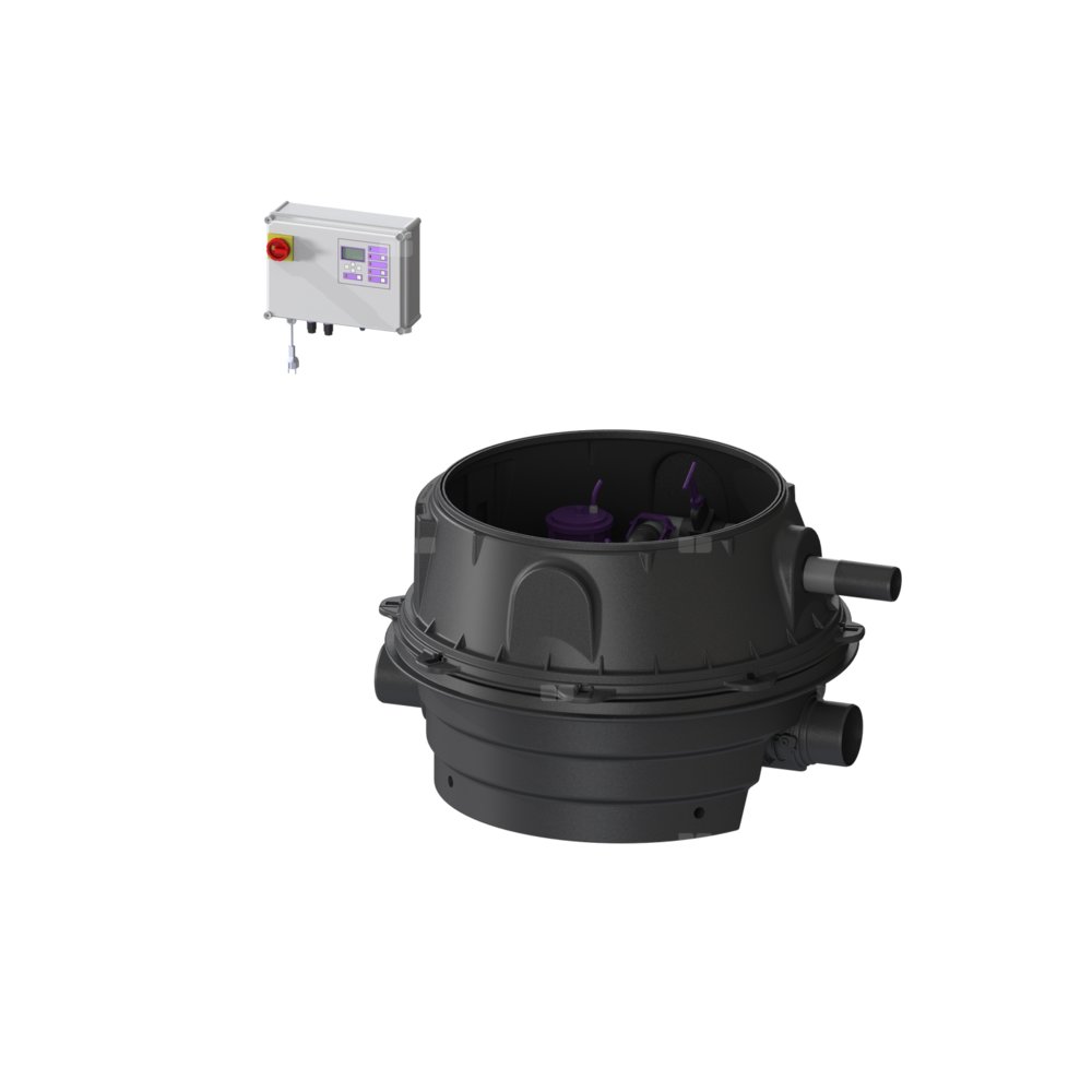 KESSEL Przepompownia przeciw. Ecolift XL, ścieków Ścieki bez fekaliów, zabudowa w ziemi, urządzenie dwupompowe, z 2 SPF 1400 pomp zatapialnych, typ pracy S1, czujnik alarmu z Sonda optyczna, sterownik Comfort Plus, Wariant z najniższą zabudową