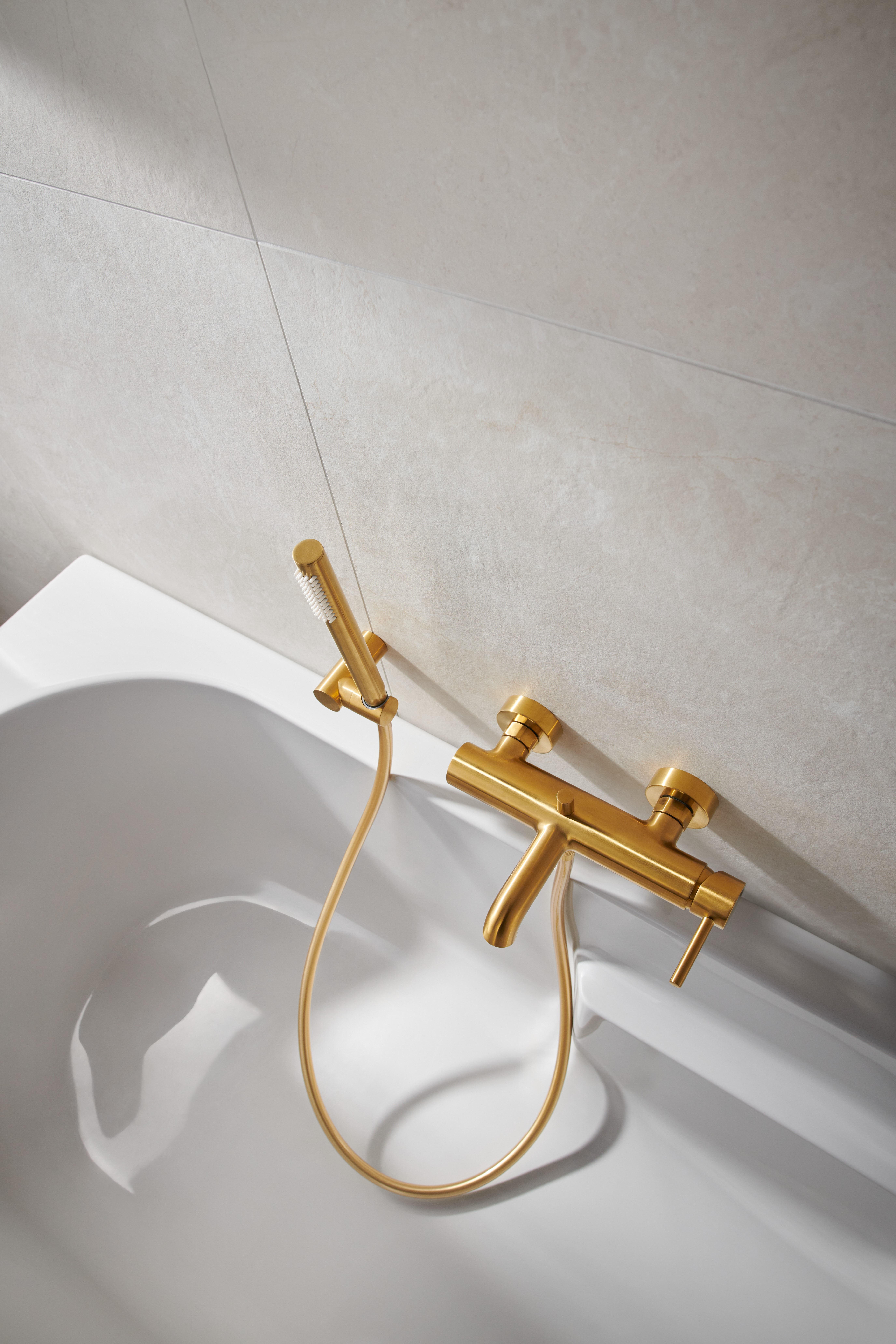 MOZA BATERIA WANNOWA POZIOMA, ŚCIENNA + ZESTAW NATRYSKOWY PUNKTOWY PREMIUM, ZŁOTY SZCZOTKOWANY PVD