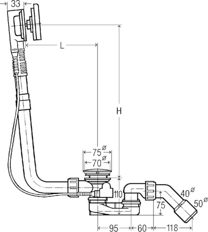 Multiplex-komplet odpływowo-przelewowy, Visign M9, podwyższenie poziomu wody plus 5 cm, płaskie wykonanie: tylko 33 mm wymaganego miejsca z tyłu wanny, do wyboru możliwość podwyższenia poziomu wody. Wyposażenie: Rozeta przelewowa, pokrętło chromowane, korek do zaworu chromowany, syfon, łuk odpływowy 45°, zawór chromowany. Dane techniczne: wysokość zamknięcia wodnego 50 mm, wydajność odpływu przy wysokości spiętrzenia 300 mm 0,92 l/s, wydajność przelewu wysokość spiętrzenia 60 mm nad środkiem otworu przelewowego 0,63 l/s. Wskazówka: Patrz aktualny przegląd wskazówek dotyczących zastosowania!, nr wzoru 6171.11, nr kat. 733 582, DN: 40/50 długość cięgna Bowdena: 725 L: 130-370 H: 180-430 wanna z odpływem pośrodku, do wanien z otworem odpływowym Ø 52,