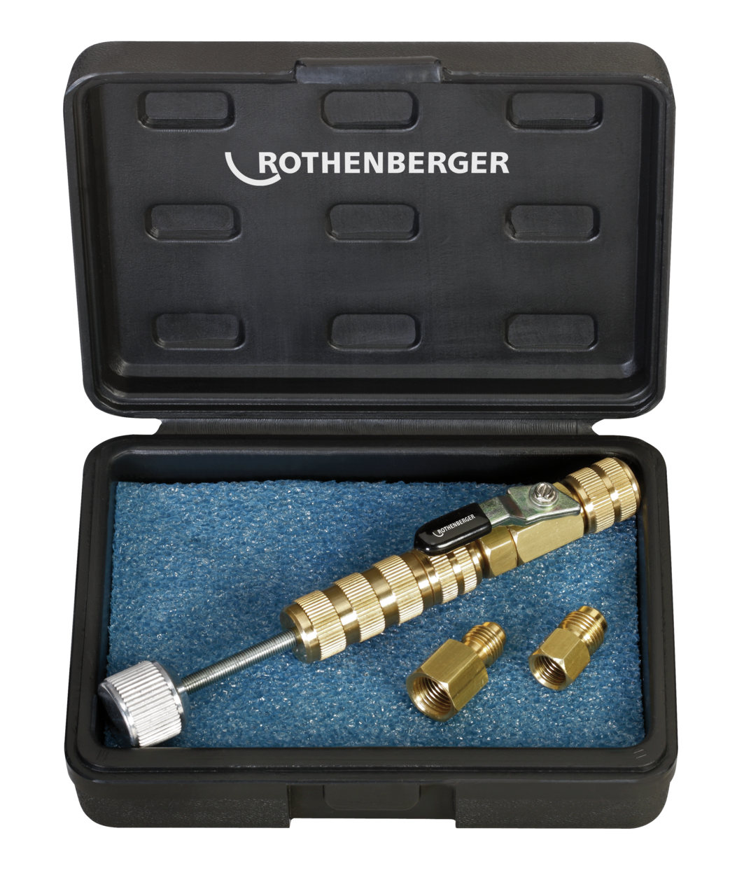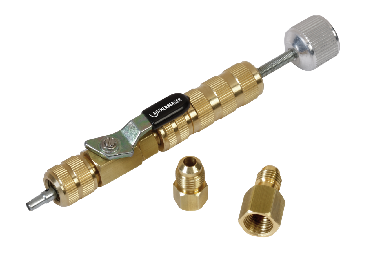 Narzędzie do zaworów Schradera firmy ROTHENBERGER umożliwia konstruktorom i technikom systemów chłodniczych wymianę uszkodzonych zaworów Schradera w systemach chłodniczych i klimatyzacyjnych. Nie jest konieczne wcześniejsze odessanie czynnika chłodniczego. Zintegrowany zawór odcinający umożliwia wymianę zaworu podczas napełniania układu czynnikiem chłodniczym. Może być stosowany w systemach zarówno z przyłączami 1/4" SAE jak i 5/16" SAE.