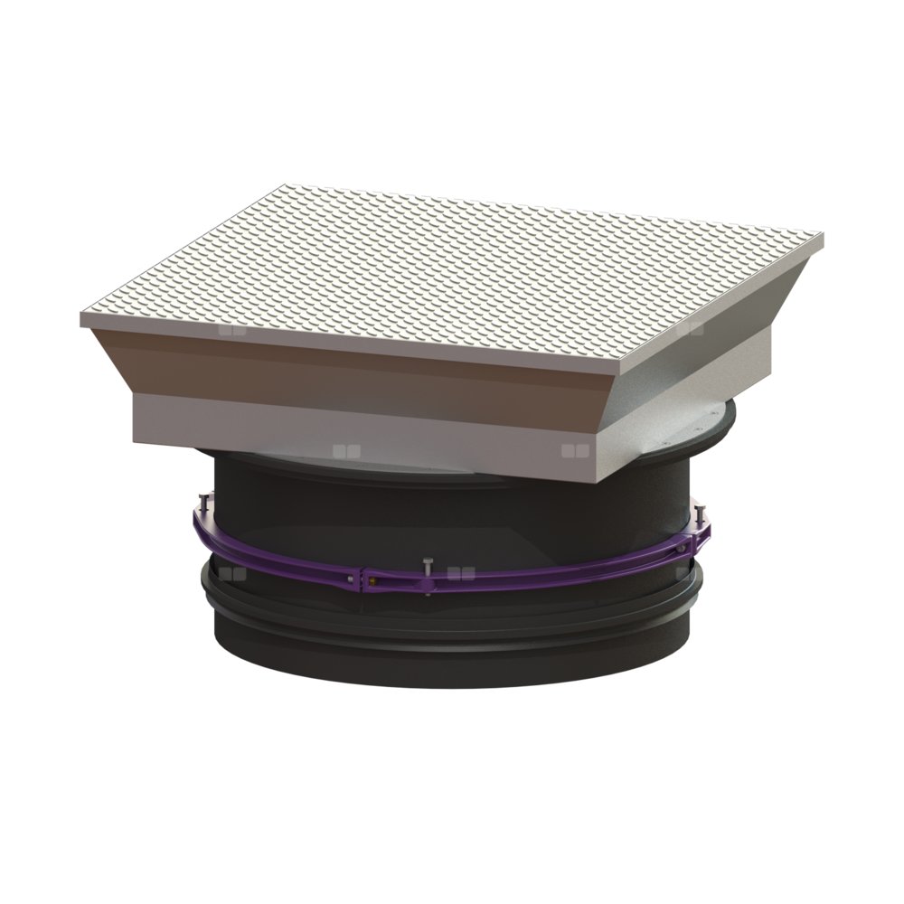 Nasada do bezstopniowego ustawienia wysokości i poziomu do studzienki LW 1000, składająca się z przejezdnej pokrywy do wbetonowania na poziomie gruntu, z wewnętrznymi przegubami, dookólną uszczelką odporną na mróz i wpływy atmosferyczne, sprężyną gazową wspierającą otwieranie i samoczynnym urządzeniem zamykającym. Betonowy pierścień należy wykonać na budowie. Pasująca do stożka z dostępem 800 mm.