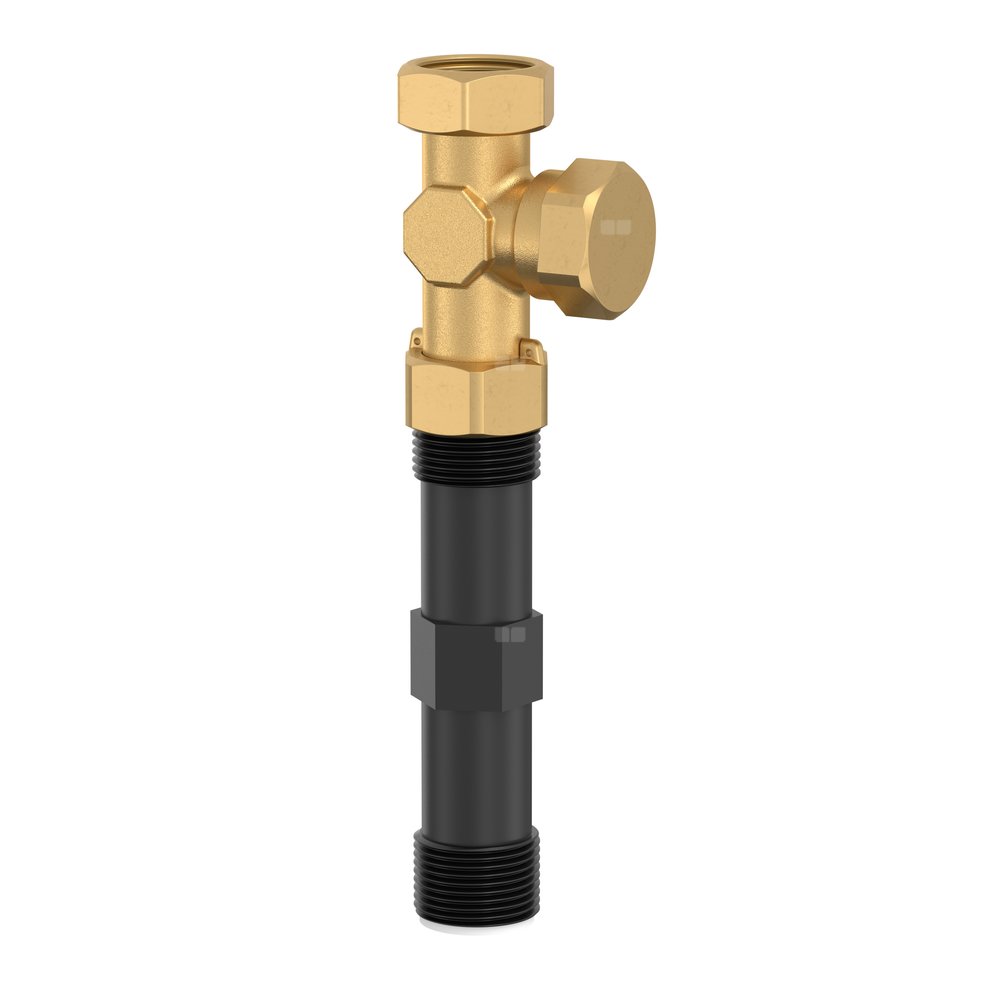 • Odejście zimnej wody na mieszkanie "LogoEco E 2nd DCW connection SP-PHE". Wstawka wodomierza z zakorkowanym trójnikiem do podłączenia przewodu zimnej wody na mieszkanie, w celu opomiarowania zużycia wody. W przypadku korzystania z tego zestawu, zawór kulowy z szyny montażowej należy wykręcić i umieścić pod wstawką wodomierza.