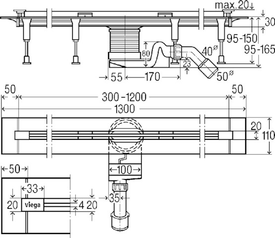 Odpływ prysznicowy prostokątny VIEGA 496520, 1200 x 110 x 95 mm, z syfonem