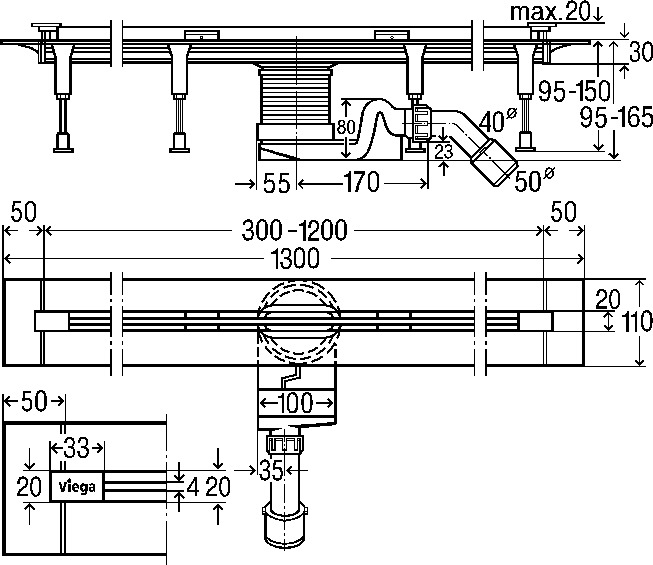 Odpływ prysznicowy prostokątny VIEGA 496521, 1200 x 110 x 95 mm, z syfonem