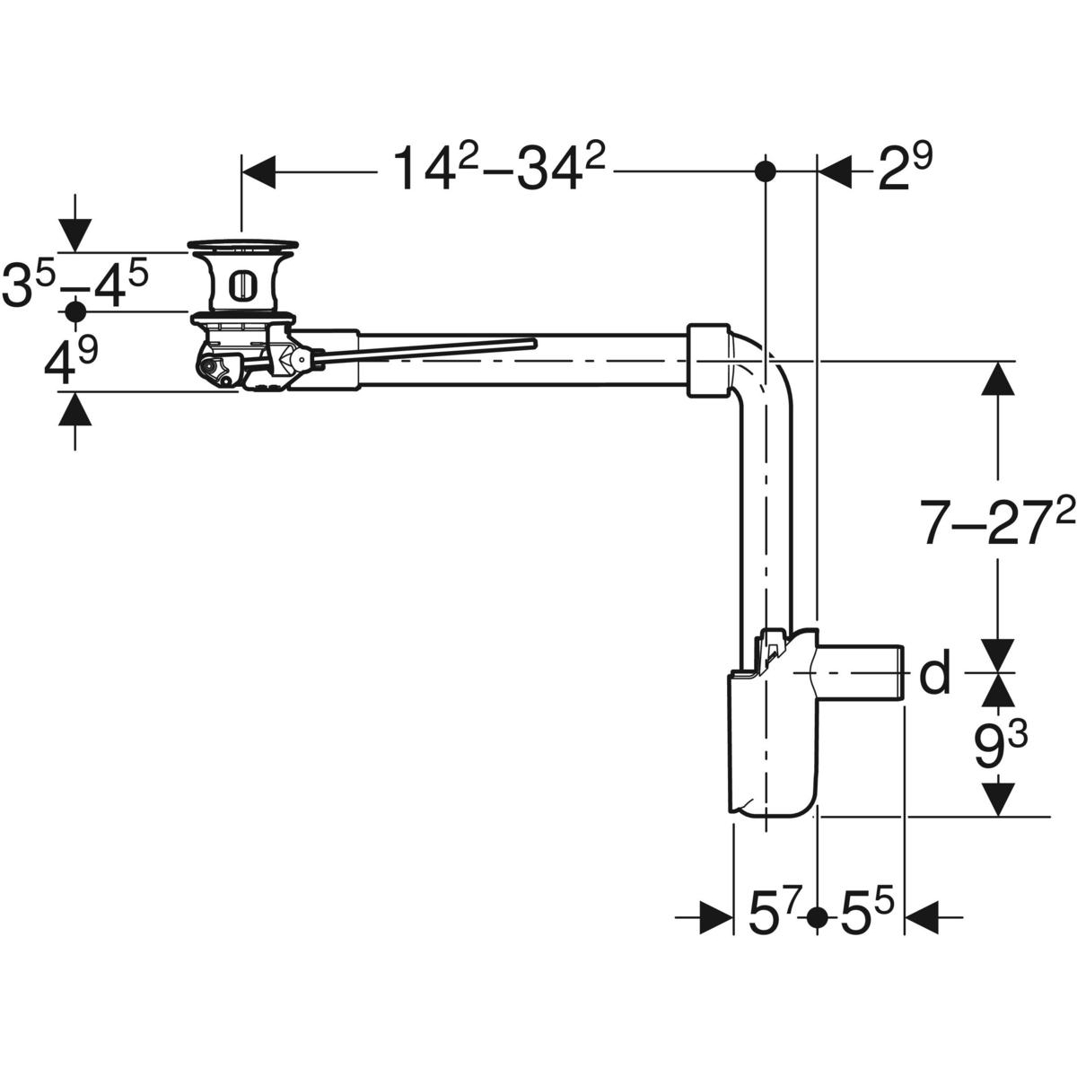Odpływ umywalkowy Geberit, model oszczędzający przestrzeń, wąski, z korkiem zaworu zewnętrznego uruchamianym za pomocą dźwigni: d=40mm, G=1 1/4″, Chrom błyszczący