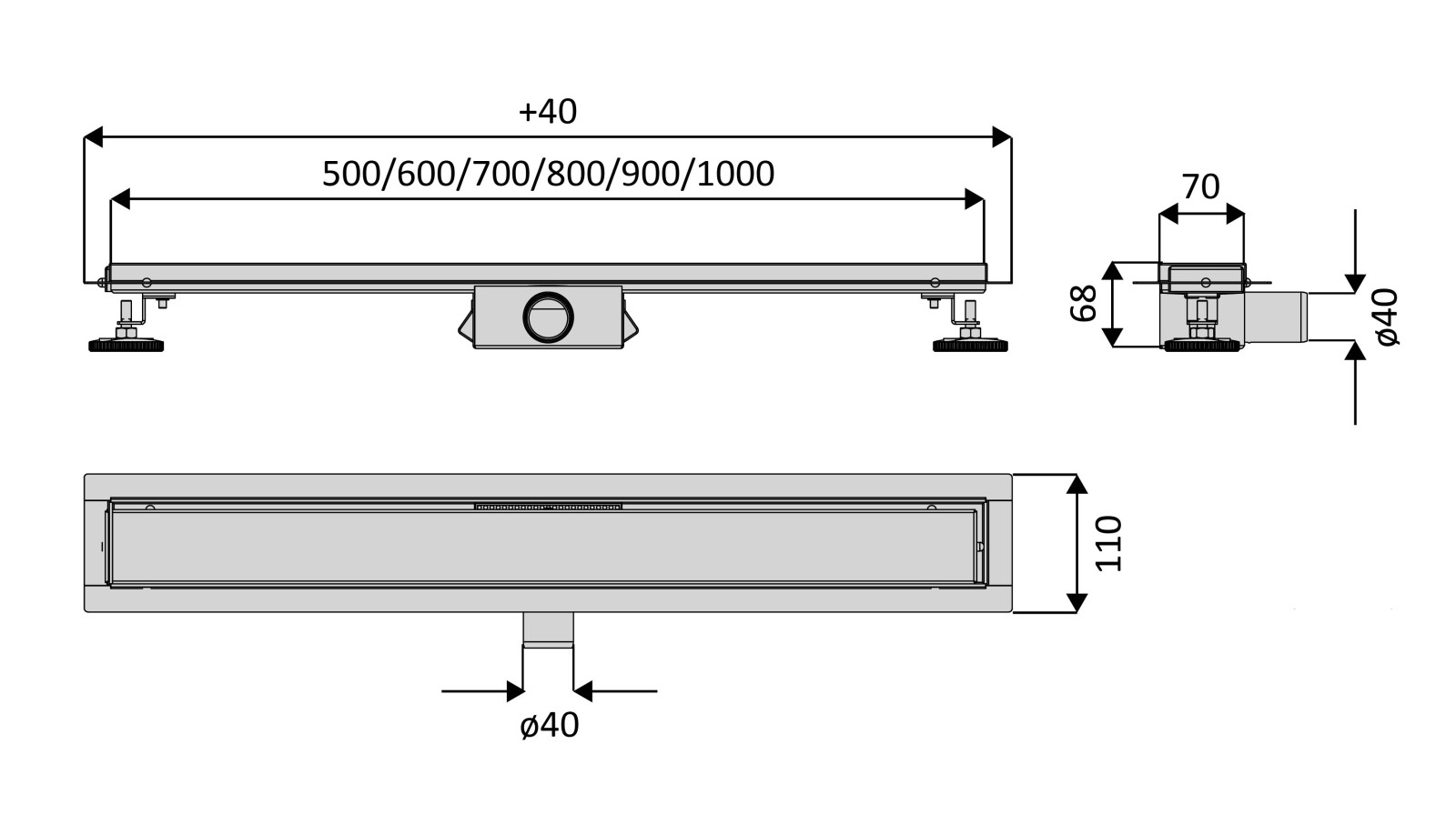 - W zestawie: Odpływ liniowy • Syfon wewnętrzny • Osadnik na włosy • Redukcja ø 40/ø 50 • Płaszcz uszczelniający (mata) • Regulowane nogi • Klucz do ściągania rusztu • Instrukcja montażu