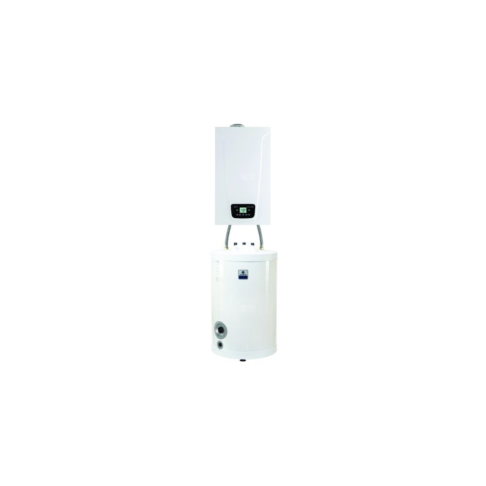 Naścienny gazowy kocioł kondensacyjny 1-funkcyjny w zestawie z emaliowanym podgrzewaczem c.w.u. o pojemności 100 lub 150 litrów umieszczony pod kotłem, chroniony antykorozyjnie anodą magnezową. Kocioł o nowatorskim projekcie i bardzo zwartej konstrukcji: 700x400x290 mm. Wyposażony w system samoadaptacji GAC, stałej kontroli jakości mieszanki gazowo-powietrznej dla utrzymania najwyższej sprawności. Wstępnie wyregulowany do pracy z gazem ziemnym GZ50, z możliwościa dostosowania do GZ41,5 oraz propanu. Przyłącze spalinowo-powietrzne 60/100 mm. Możliwość podłączenia do przewodu powietrzno-spalinowego poziomego lub pionowego (homologacje C13 i C33), do komina (B23p i C93), adaptera bi-flux (C53) lub przewodu 3CE (C43). Średnioroczna sprawnośc do 109,8%. Niska emisja zanieczyszczeń: NOx < 19,3 mg/kWh. Kompaktowy toroidalny wymiennik ze stali nierdzewnej o wysokiej sprawności. Cylindryczny palnik ze stali nierdzewnej modulujący w zakresie od 14 do 100% mocy, wentylator z tłumikiem zasysania powietrza. Moduł hydrauliczny zawierający pompę modulowaną kl. A o współczynniku EEI<0,23, zawór przełączający c.o./ c.w.u. zamontowany na zasilaniu, zawór bezp. c.o. 3 bar. Naczynie wzbiorcze o poj. 7 litrów. Elektroniczna konsola sterownicza z ekranem LCD i przyciskami funkcyjnymi do prostego wyboru funkcji oraz wywołania menu serwisowego. Przewody połączeniowe kocioł/podgrzewacz i czujnik c.w.u. w zakresie dostawy. W opcji dostępny czujnik zewn. do sterowania pogodowego oraz pełna gama modulujacych termostatów. . . . .