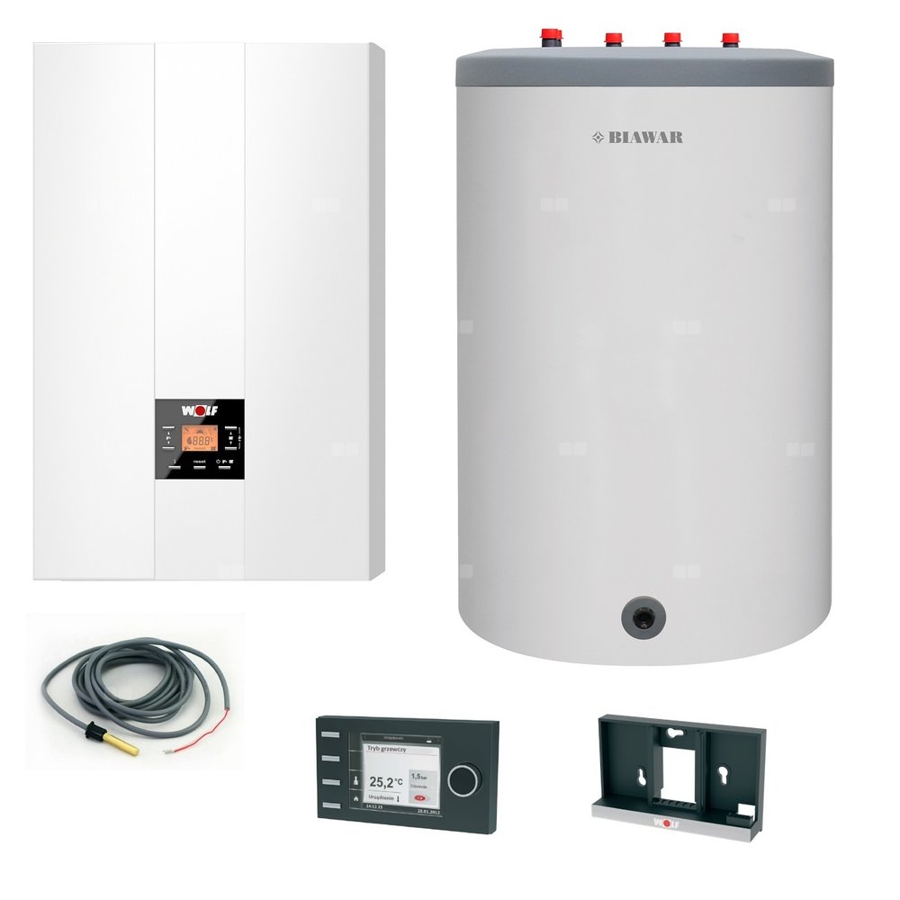 Gazowy kocioł kondensacyjny Wolf FGB 24 z zasobnikiem c.w.u. Biawar Lindo 120 i czujnikiem temperatury c.w.u. oraz modułem pogodowym BM-2 i podstawą ścienną do modułu BM-2.