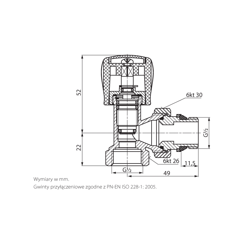PHA-032A G1/2 WZ PN10 DN15 Zawór grzejnikowy K gwint samouszczelniający CuZn-C PN-M-75002