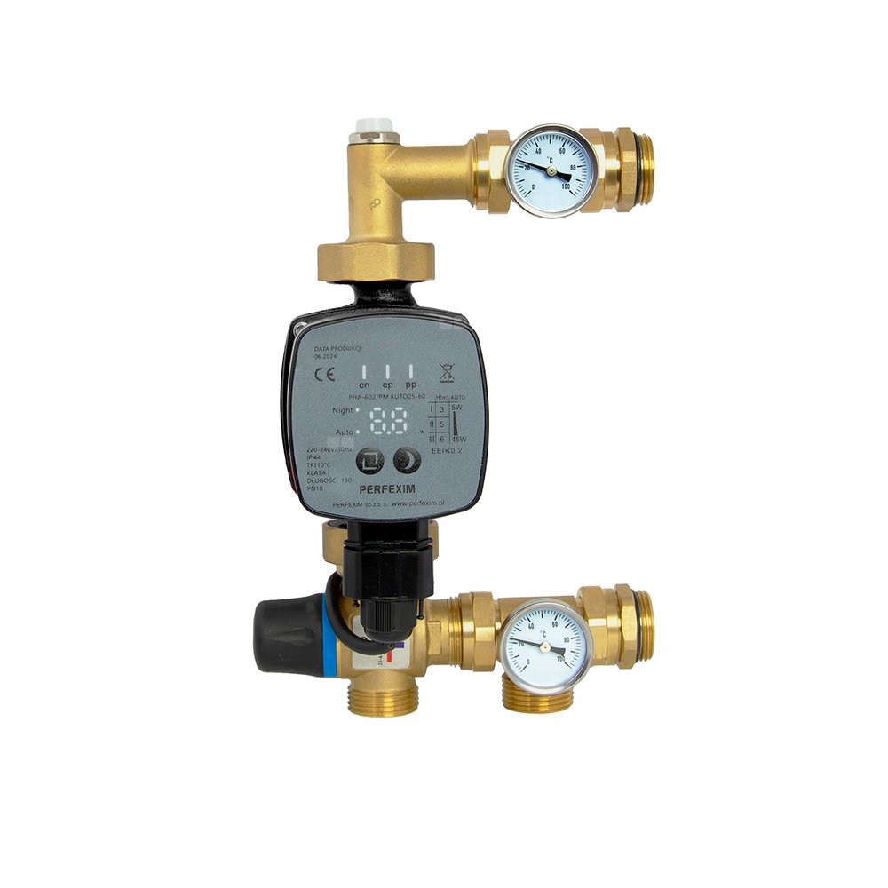 PHA-131/PM Zespół mieszający do ogrzewania podłogowego z pompą PHA-602/PM i z-rem trójdrożnym termost. Temp. 20-45 stopni C, kvs 2,5 (do belek rozdzielaczy z rozstawem 210mm)