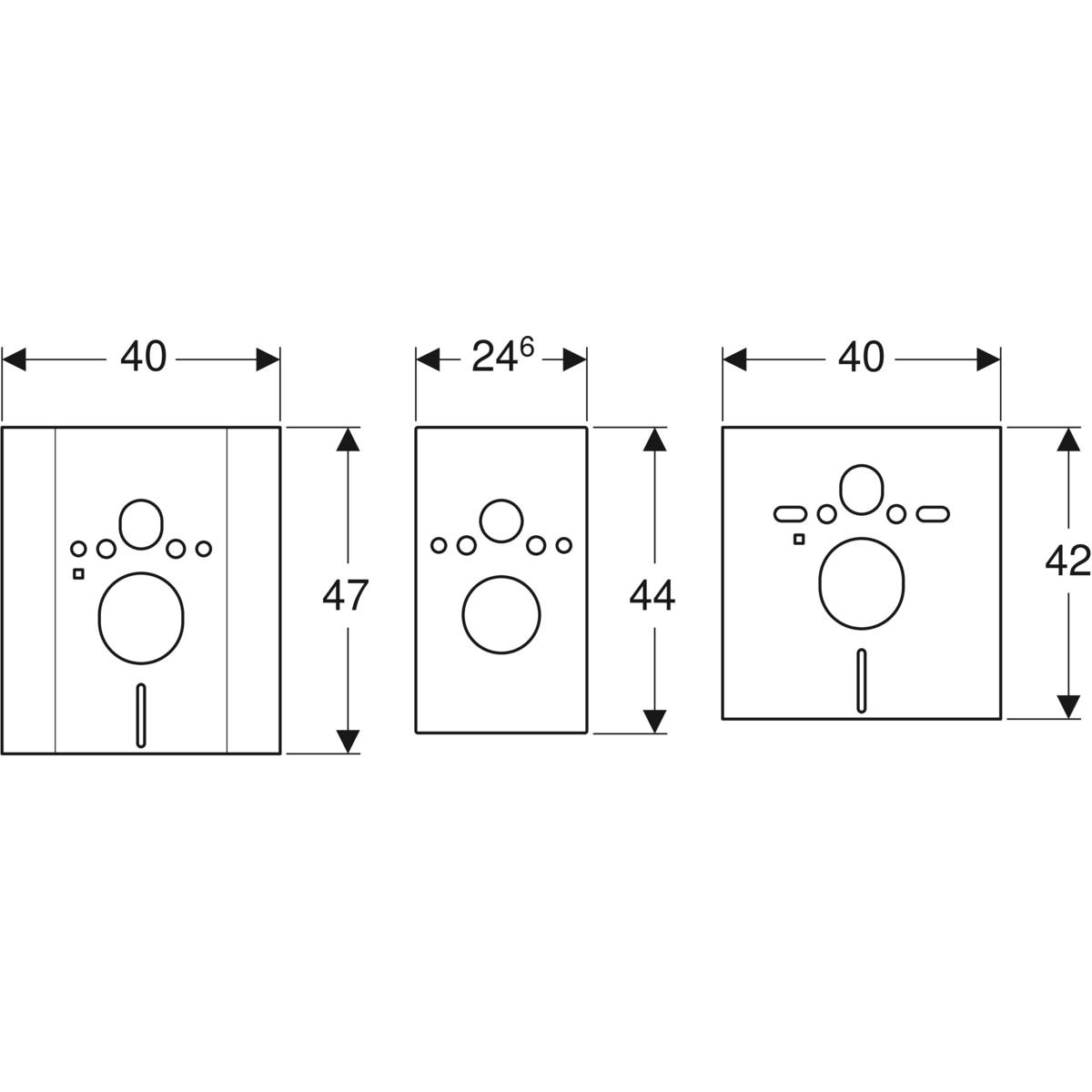 Seria 2025 Statyczna rama samonośna, zabezpieczona przed korozją powłoką malowaną proszkowo Rama do wiszących misek WC o wymiarach przyłączeniowych zgodnych z normą EN 33 i wysunięciu do 70 cm Z wysuwaną blachą do bocznego mocowania nad elementem na profilach metalowych lub drewnianych bądź na elementach konstrukcyjnych Geberit Duofix Alternatywna pozycja mocowania wspornika dystansowego Obrotowe stopy, odpowiednie do montażu w profilach U UW 50 i UW 75 Stopy można zamontować w szynie systemowej Geberit Duofix bez użycia narzędzi, bez dodatkowych komponentów Ocynkowane nogi montażowe, zabezpieczone przed korozją, antypoślizgowe Kolano przyłączeniowe z możliwością montażu na różnych głębokościach bez użycia narzędzi, zakres regulacji 45 mm Spłuczka podtynkowa Geberit Sigma 12 cm, z izolacją przeciwroszeniową Do uruchamiania z przodu, nadaje się do spłukiwania jednoilościowego, dwudzielnego i spłukiwania z funkcją "stop" W przypadku ustawień fabrycznych ponowne spłukiwanie możliwe natychmiast Prace montażowe i serwisowe przy spłuczce podtynkowej bez użycia narzędzi Przyłącze wody z tyłu lub na górze na środku Obudowa ochronna otworu rewizyjnego z możliwością skrócenia, chroni przed wilgocią i zabrudzeniami Z peszlem ochronnym do dopływu dla toalet myjących Geberit AquaClean i do przewodu przyłączeniowego Mocowanie przyłącza elektrycznego i Power & Connect Box Do metalowych i drewnianych ścianek konstrukcyjnych Do ścianek systemowych Geberit Duofix Do montażu w ściankach instalacyjnych o częściowej wysokości lub wysokości pomieszczenia Do montażu w ściankach działowych na wysokość pomieszczenia Do wysokości warstw podłogi 0–25 cm Do misek wiszących