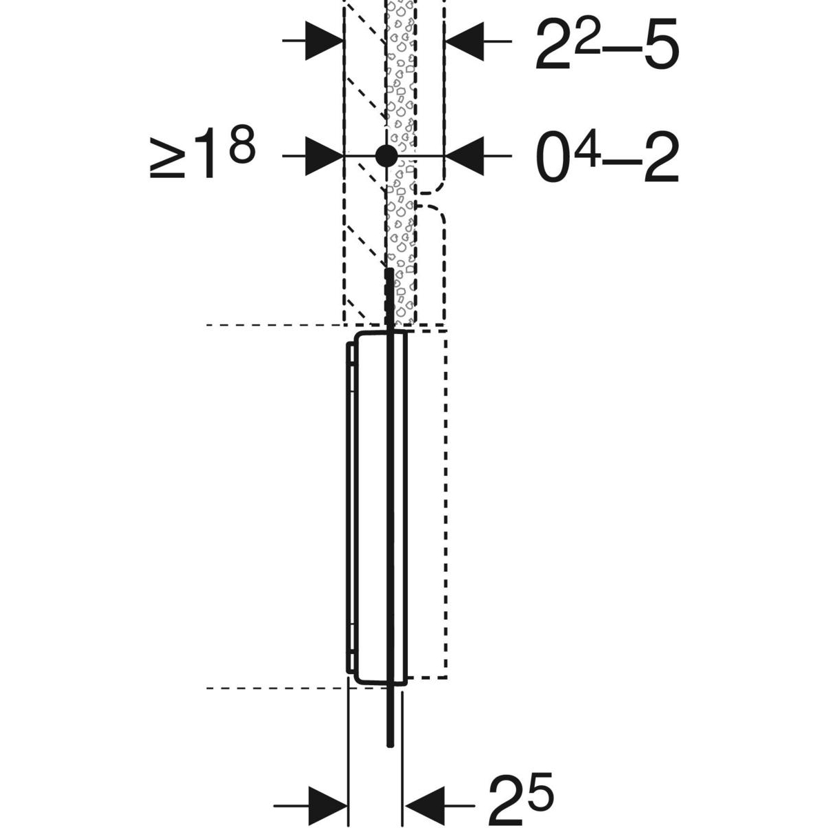 Seria 2025 Statyczna rama samonośna, zabezpieczona przed korozją powłoką malowaną proszkowo Rama do wiszących misek WC o wymiarach przyłączeniowych zgodnych z normą EN 33 i wysunięciu do 70 cm Z wysuwaną blachą do bocznego mocowania nad elementem na profilach metalowych lub drewnianych bądź na elementach konstrukcyjnych Geberit Duofix Alternatywna pozycja mocowania wspornika dystansowego Obrotowe stopy, odpowiednie do montażu w profilach U UW 50 i UW 75 Stopy można zamontować w szynie systemowej Geberit Duofix bez użycia narzędzi, bez dodatkowych komponentów Ocynkowane nogi montażowe, zabezpieczone przed korozją, antypoślizgowe Kolano przyłączeniowe z możliwością montażu na różnych głębokościach bez użycia narzędzi, zakres regulacji 45 mm Spłuczka podtynkowa Geberit Sigma 12 cm, z izolacją przeciwroszeniową Do uruchamiania z przodu, nadaje się do spłukiwania jednoilościowego, dwudzielnego i spłukiwania z funkcją "stop" W przypadku ustawień fabrycznych ponowne spłukiwanie możliwe natychmiast Prace montażowe i serwisowe przy spłuczce podtynkowej bez użycia narzędzi Przyłącze wody z tyłu lub na górze na środku Obudowa ochronna otworu rewizyjnego z możliwością skrócenia, chroni przed wilgocią i zabrudzeniami Z peszlem ochronnym do dopływu dla toalet myjących Geberit AquaClean i do przewodu przyłączeniowego Mocowanie przyłącza elektrycznego i Power & Connect Box Do metalowych i drewnianych ścianek konstrukcyjnych Do ścianek systemowych Geberit Duofix Do montażu w ściankach instalacyjnych o częściowej wysokości lub wysokości pomieszczenia Do montażu w ściankach działowych na wysokość pomieszczenia Do wysokości warstw podłogi 0–25 cm Do misek wiszących