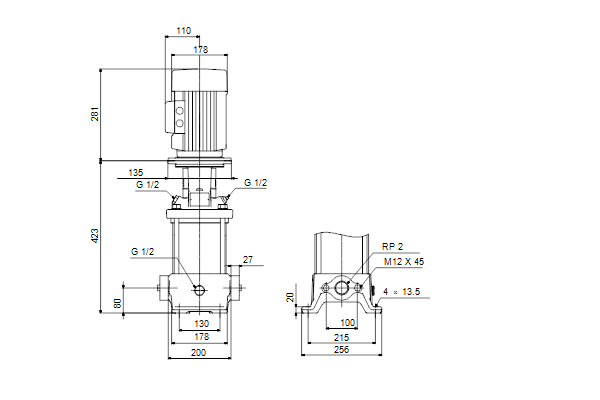 Pionowa, wielostopniowa pompa odśrodkowa z króćcami ssawnym i tłocznym na tym samym poziomie (linii). Głowica pompy i podstawa wykonane są z żeliwa - wszystkie inne części zwilżane wykonane są ze stali nierdzewnej. Kasetowe uszczelnienie wału zapewnia wysoką niezawodność, bezpieczeństwo obsługi oraz łatwy serwis i dostęp. Przeniesienie mocy odbywa się poprzez sprzęgło dzielone. Pompa jest wyposażona w 3-fazowy asynchroniczny silnik elektryczny, chłodzony wentyl