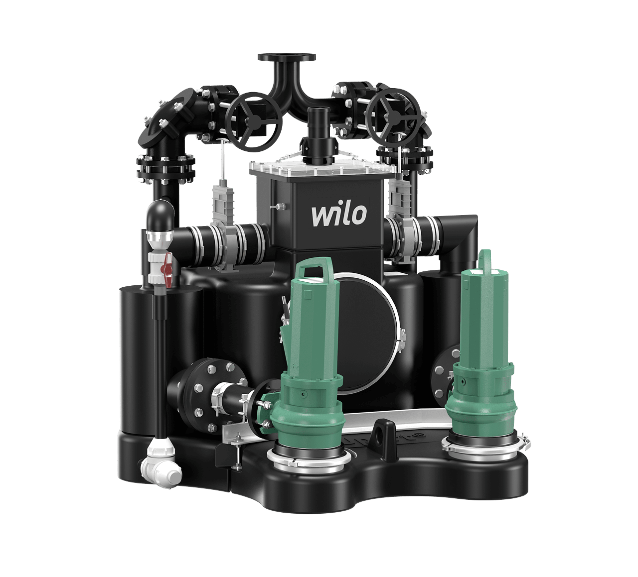 Gotowe do podłączenia, całkowicie zanurzone urządzenie do przetłaczania ścieków ze zintegrowanym systemem filtrowania zanieczyszczeń stałych wg DIN EN 12050-1. W wersji pompowni z systemem separacji części stałych duże zanieczyszczenia zostają odseparowane przed pompami i nie stykają się z nimi, co zapewnia najwyższy stopień niezawodności. Jednoczęściowy, gazo- i wodoszczelny zbiornik retencyjny bez konstrukcyjnych połączeń spawanych oraz dwa oddzielnie odcinane i konserwowane z zewnątrz zbiorniki separatora części stałych. Odcięcie pojedynczych urządzeń pozwala na wykonywanie prac konserwacyjnych podczas pracy. Do tłoczenia służą dwie pełnowartościowe pompy zatapialne do ścieków do ustawienia na sucho, do pracy naprzemiennej. Ustawienie na sucho i wykonanie w wersji nadmiarowego układu dwupompowego gwarantuje maksymalne uproszczenie konserwacji, a także najwyższy stopień higieny i niezawodności. Zbiornik retencyjny posiada zaokrąglenia, dno zbiornika jest ukośne, najniższy punkt