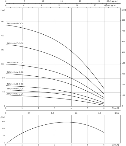 Całkowicie zanurzona, wielostopniowa pompa głębinowa z promieniowymi lub półosiowymi wirnikami o budowie segmentowej do montażu pionowego lub poziomego, z wbudowanym zabezpieczeniem przed przepływem zwrotnym. Odporny na korozję silnik prądu zmiennego lub indukcyjny trójfazowy do rozruchu bezpośredniego, napełniony mieszaniną wody i glikolu. Hermetycznie zalany silnik z uzwojeniem emaliowanym, impregnowany żywicą, z łożyskami samosmarującymi. Chłodzenie silnika odbywa się poprzez przetłaczane medium. Dlatego podczas pracy urządzenie musi być zawsze zanurzone. Przy montażu poziomym konieczny jest płaszcz chłodzący.