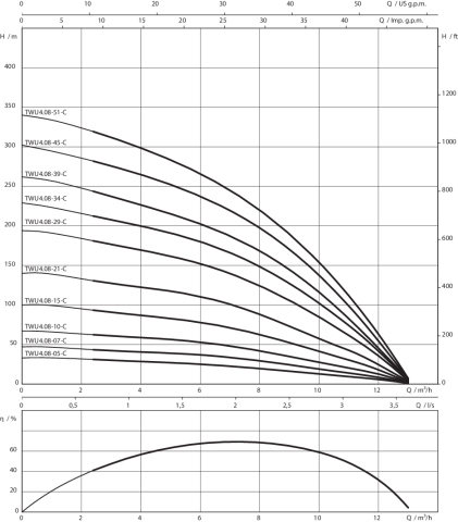 Całkowicie zanurzona, wielostopniowa pompa głębinowa z promieniowymi lub półosiowymi wirnikami o budowie segmentowej do montażu pionowego lub poziomego, z wbudowanym zabezpieczeniem przed przepływem zwrotnym. Odporny na korozję silnik prądu zmiennego lub indukcyjny trójfazowy do rozruchu bezpośredniego, napełniony mieszaniną wody i glikolu. Hermetycznie zalany silnik z uzwojeniem emaliowanym, impregnowany żywicą, z łożyskami samosmarującymi. Chłodzenie silnika odbywa się poprzez przetłaczane medium. Dlatego podczas pracy urządzenie musi być zawsze zanurzone. Przy montażu poziomym konieczny jest płaszcz chłodzący.