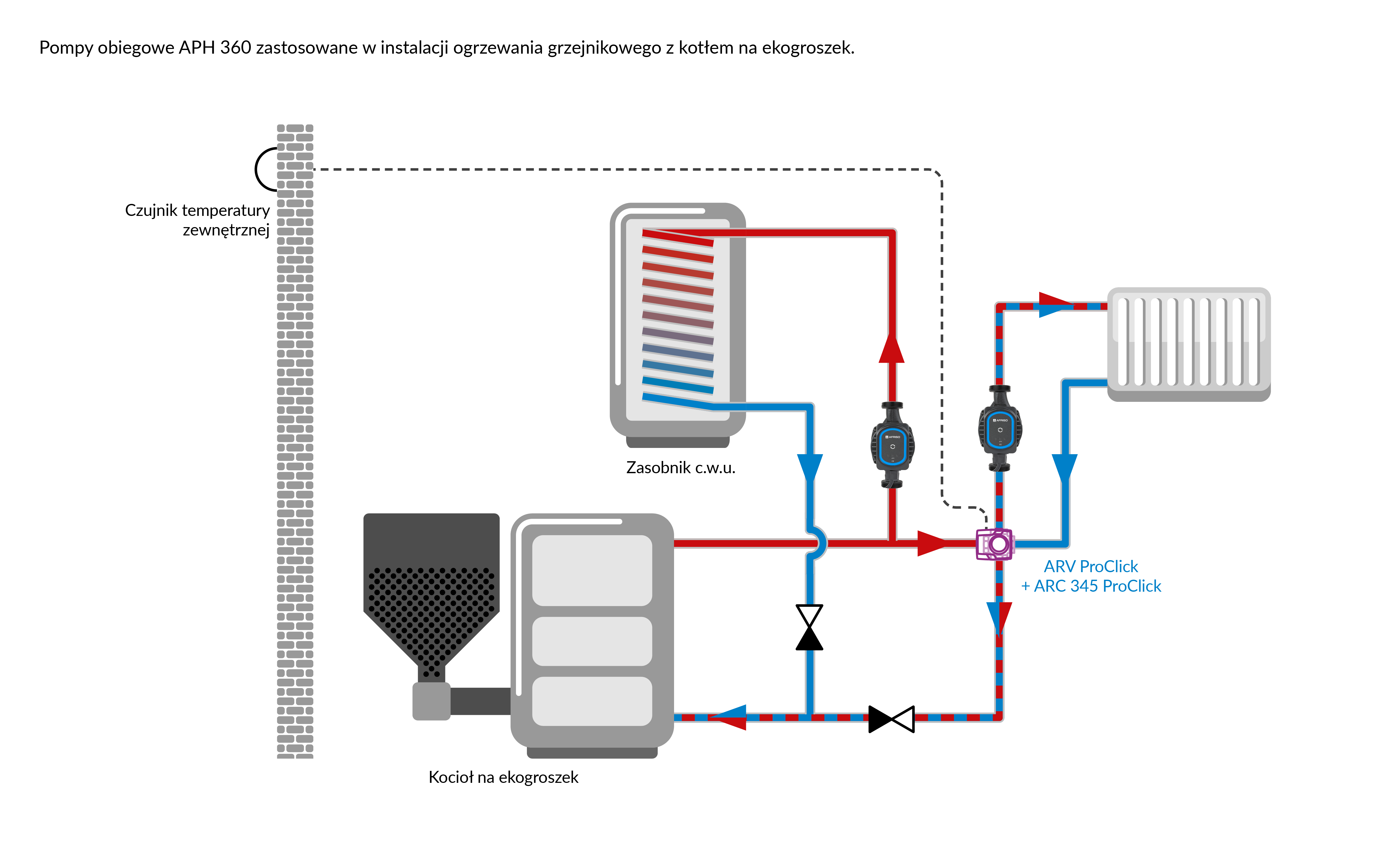 Przetłacza czynnik grzewczy ze źródła do emiterów ciepła.