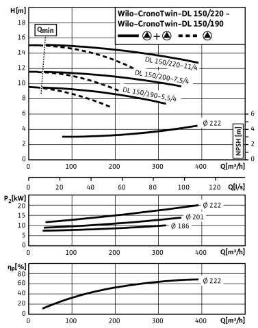 Pompa obiegowa WILO CronoTwin-DL 150/220-11/4-IE3 typu in-line z silnikiem znormalizowanym 50 Hz, moc silnika 11kW 22 A 1450 obr/min, wlot Kołnierz DN 150