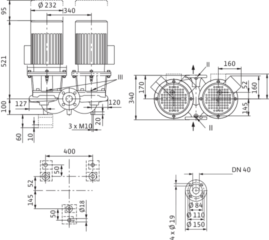 Pompa podwójna Inline z dwiema jednostopniowymi dławnicowymi pompami wirowymi we wspólnym korpusie z klapą przełączającą, do montażu na rurociągu lub do ustawienia na fundamencie. Kołnierz zaślepiający na korpusie i konsole za dopłatą. Odporna na drgania, zapewniająca cichą pracę konstrukcja blokowa z latarnią i sztywno połączonym standardowym silnikiem kołnierzowym (silnik znormalizowany). Z niezależnym od kierunku obrotów mieszkowym uszczelnieniem mechanicznym z wymuszonym opływem oraz wirnikiem redukującym kawitację. Kołnierze z przyłączami pomiarowymi ciśnienia R 1/8. Korpus pompy i latarnia z powłoką kataforetyczną.