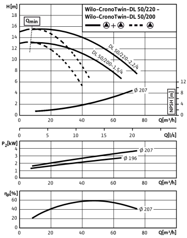 Pompa obiegowa WILO CronoTwin-DL 50/220-2,2/4-IE3 typu in-line z silnikiem znormalizowanym 50 Hz, moc silnika 2.2kW 4.9 A 1450 obr/min, wlot Kołnierz DN 50