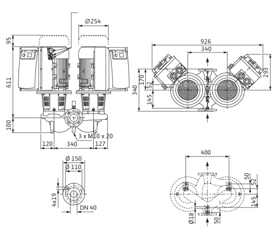 Dławnicowa pompa podwójna o konstrukcji Inline do montażu na rurociągu lub do ustawienia na fundamencie z wbudowaną przetwornicą częstotliwości do regulacji elektronicznej m.in. wg stałej i zmiennej różnicy ciśnień (Δp-c/Δp-v)