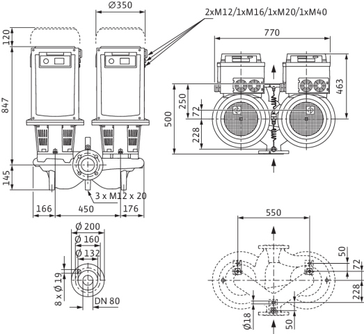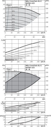Pompa obiegowa WILO CronoTwin-DL-E 80/200-22/2 IE4 typu in-line z silnikiem znormalizowanym 50/60 Hz, moc silnika 22kW 37.4 A 2900 obr/min, wlot Kołnierz DN 80