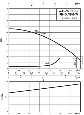 Pompa obiegowa WILO VeroLine-IPH-W 20/160-1,1/2-IE3 typu in-line z silnikiem znormalizowanym 50 Hz, moc silnika 1.1kW 2.3 A 2825 obr/min, wlot Kołnierz