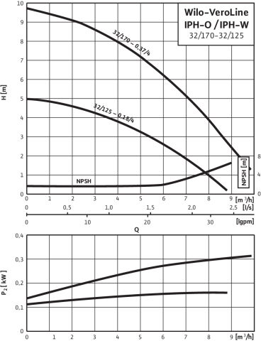 Pompa obiegowa WILO VeroLine-IPH-W 32/125-0,18/4 typu in-line z silnikiem znormalizowanym 50 Hz, moc silnika 0.18kW 0.62 A 1410 obr/min, wlot Kołnierz DN 32