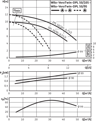 Pompa obiegowa WILO VeroTwin-DPL 50/95-0,55/2 typu in-line z silnikiem znormalizowanym 50 Hz, moc silnika 0.55kW 1.33 A 2900 obr/min, wlot Kołnierz DN 50