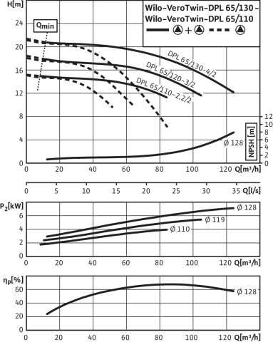 Pompa obiegowa WILO VeroTwin-DPL 65/130-4/2-IE3 typu in-line z silnikiem znormalizowanym 50 Hz, moc silnika 4kW 7.75 A 2900 obr/min, wlot Kołnierz DN 65