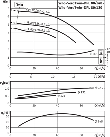 Pompa obiegowa WILO VeroTwin-DPL 80/125-0,75/4-IE3 typu in-line z silnikiem znormalizowanym 50 Hz, moc silnika 0.75kW 1.57 A 1450 obr/min, wlot Kołnierz DN 80