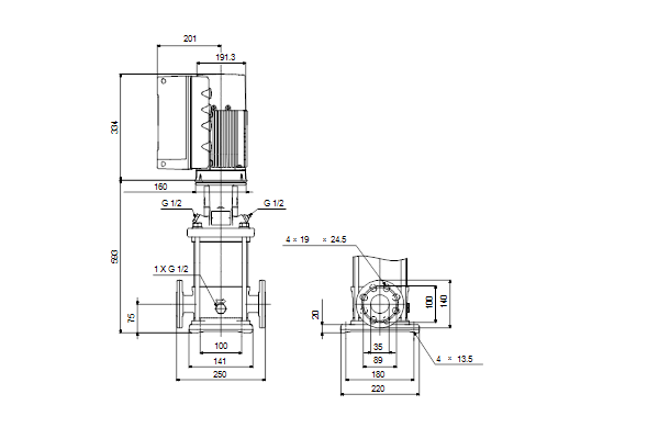 Pionowa, wielostopniowa pompa odśrodkowa z króćcami ssawnym i tłocznym na tym samym poziomie (linii). Głowica pompy i podstawa wykonane są z żeliwa - wszystkie inne części zwilżane wykonane są ze stali nierdzewnej. Specjalna konstrukcja „niskiego NPSH” obniża wartość NPSH pompy.