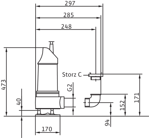 Całkowicie zanurzona pompa zatapialna do wody zanieczyszczonej, pionowe ustawienie mokre, do tłoczenia wody zanieczyszczonej i zawierającej piasek Korpus hydrauliczny i wirnik z żeliwa szarego, korpus silnika z aluminium. Przyłącze tłoczne z pionowym odpływem ciśnieniowym i złączem typu Storz. Samochłodzący silnik w wersji na prąd zmienny jednofazowy, z odłączanym kablem zasilającym i wyłącznikiem pływakowym z wtyczką z uziemieniem i kondensatorem roboczym. Do uszczelnienia po stronie medium i silnika służy uszczelnienie mechaniczne. Agregat można stosować w podsysającym trybie pracy bez ograniczeń.