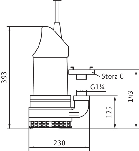 Całkowicie zanurzona pompa zatapialna do wody zanieczyszczonej, pionowe ustawienie mokre, do tłoczenia wody zanieczyszczonej i zawierającej piasek Korpus hydrauliczny i wirnik z żeliwa szarego, korpus silnika z aluminium. Przyłącze tłoczne z pionowym odpływem ciśnieniowym i złączem typu Storz. Samochłodzący silnik w wersji na prąd zmienny jednofazowy, z odłączanym kablem zasilającym i wtyczką z uziemieniem i kondensatorem roboczym. Do uszczelnienia po stronie medium i silnika służy uszczelnienie mechaniczne. Agregat można stosować w podsysającym trybie pracy bez ograniczeń.